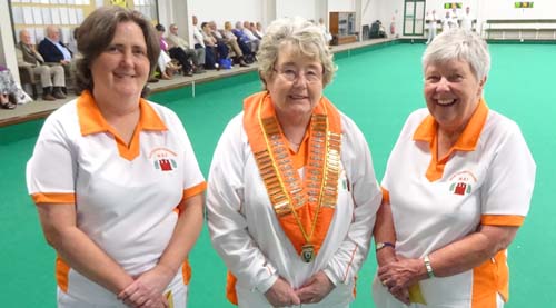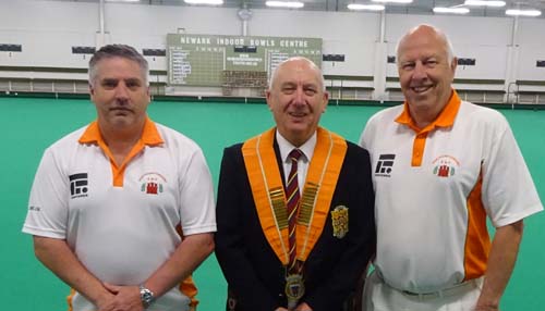 Elsewhere Moira Holroyd (Stamford Town) and Glenys Edwards (Ketton) – pictured with NWBF PRESIDENT Jessica Phillips – lost 21-11 to Durham and the combination of Chris Ballard (Vanguard), Mick Humphreys (City of Peterborough) and John Holroyd ( Stamford Town) found the triples challenge of tournament favourites Simon Leader, and Rob and Ed Elmore (Hunts) too tough, losing 27-8.