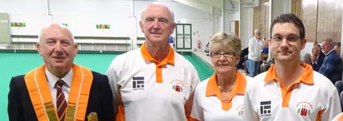 In the mixed triples the combination of Adam Warrington and Martyn Dolby (Blackstones) and Christine Ford (Ketton) – pictured above with President Tony Mace – proved too strong for Humberside, running out 24-13 winners. They then lost to Ian Riches’ Durham rink 12-21.