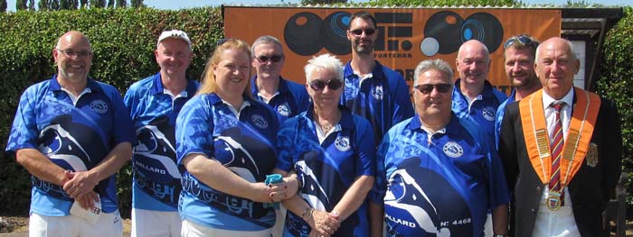 Parkway (back row, left to right): Howard Shipp, Jeff Newson, Kevin Stanford, Andrew Thurston, Stuart Reynolds, Tristan Morton (Front): Emma Thurston, Pat Reynolds, Fred Addy, Tony Mace (NBF president).