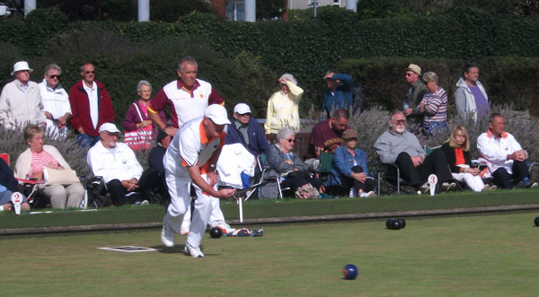 Watching the lines closely from the bank ready to start his Veterans Singles match on the same rink, was Bob Warters who had earlier beaten Derbyshire president Colin Sims 21-16 after trailing 10-15.