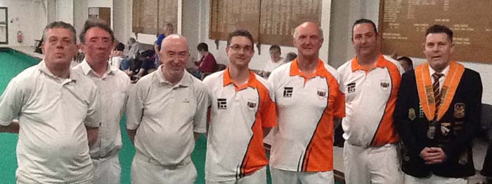 Pictured after their first round triples win against Northumberland, Adam Warrington, Martyn Dolby and Jon Earl with NBF president Dick Noble.