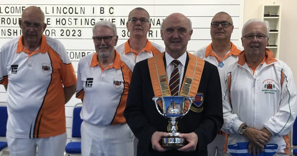 Led by county president Martyn Dolby, they emerged unbeaten from their four 11-end matches with 22 points out of a possible 24 – two for each match won and two for each winning rink – edging Notts (20) into second place and receiving the trophy from national president Ian Bratton.